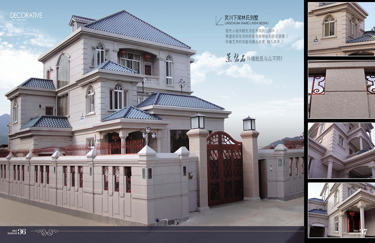 適用于山莊別墅、酒店、賓館、娛樂場所、商業會所等建筑物內外墻大面積使用。